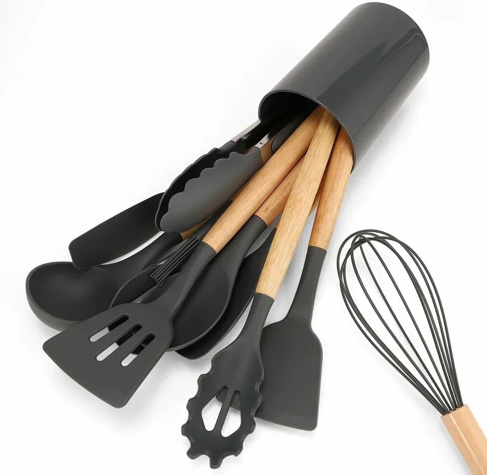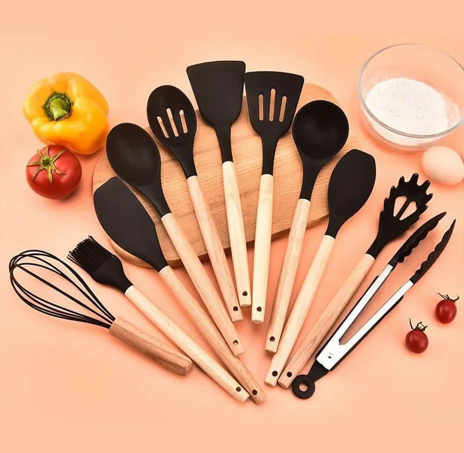 12 pcs Silicone spoon set Heat Resistant Wooden Handle and Holder Easy to Clean