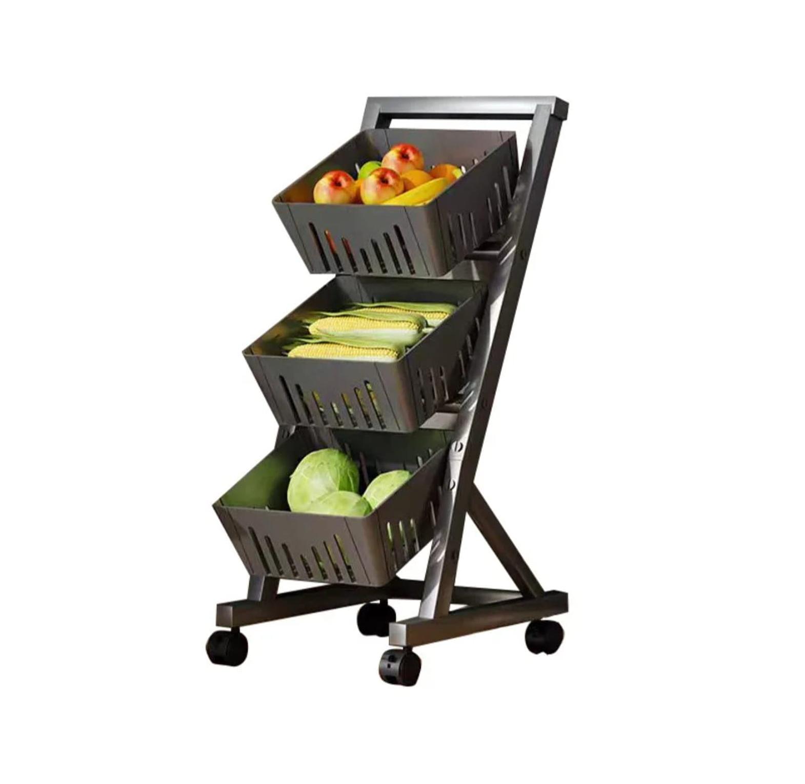 3 Tier Multi- Functional Steel Vegetable & Fruit Rack with movable and lockable wheels. Strong load bearing Rack for Household use.
