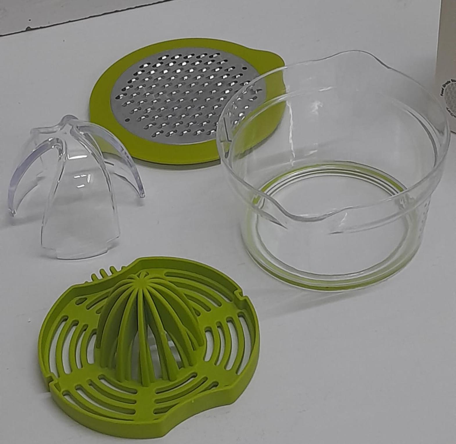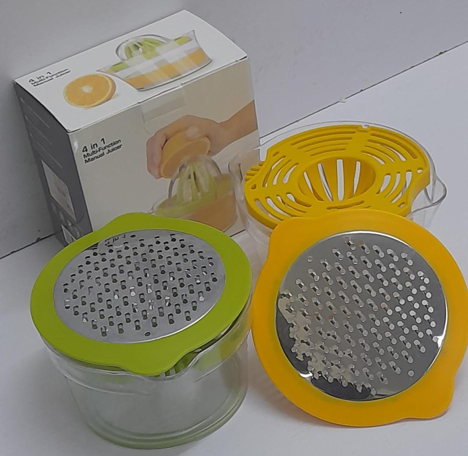 4 in 1 Multifunctional Juicer Cup Capacity 340ml √Has a grater √Has a york separater √Has a Lemon squeezer √Has a measuring cup