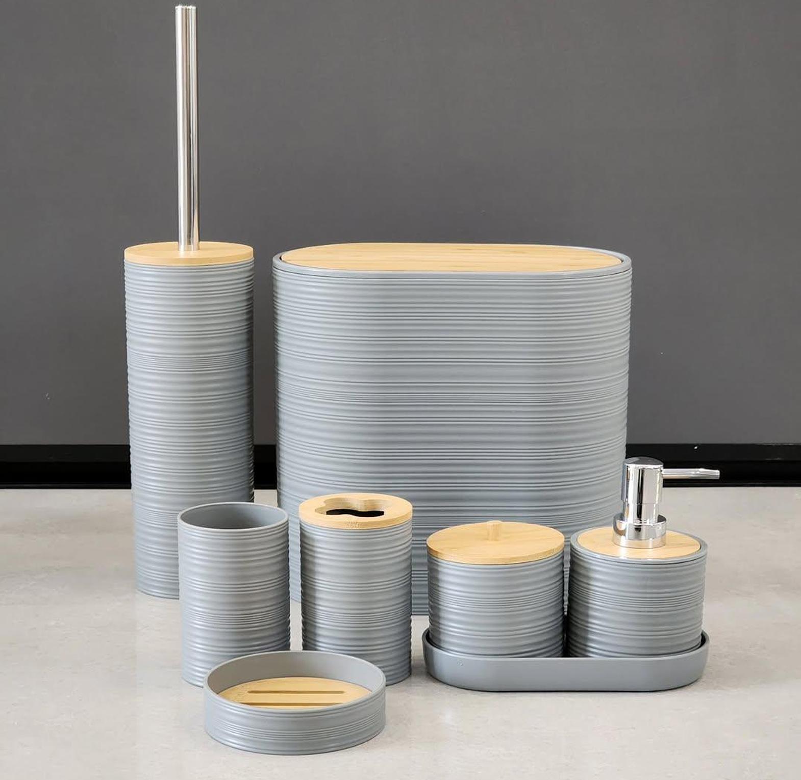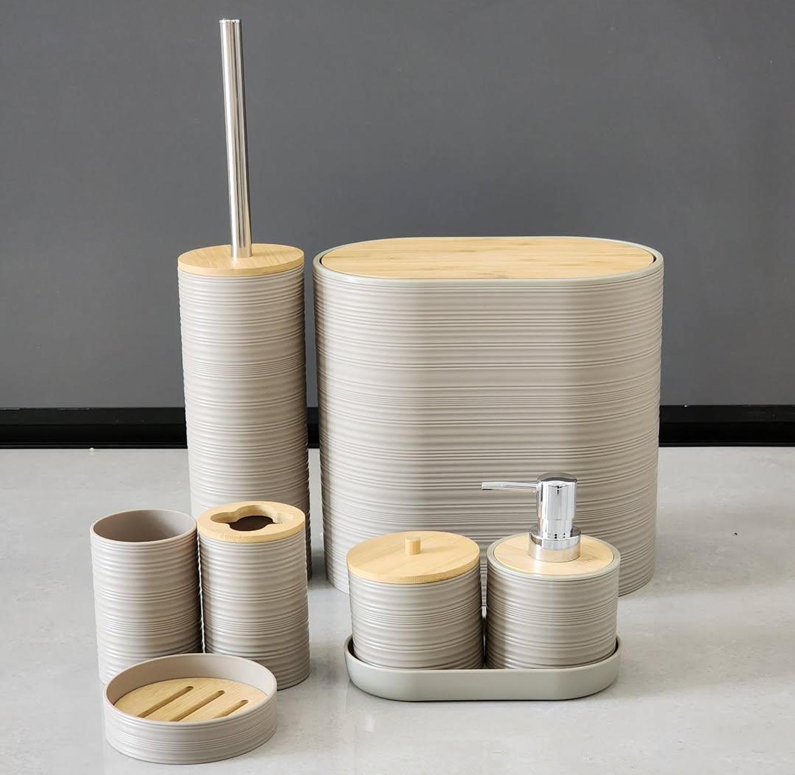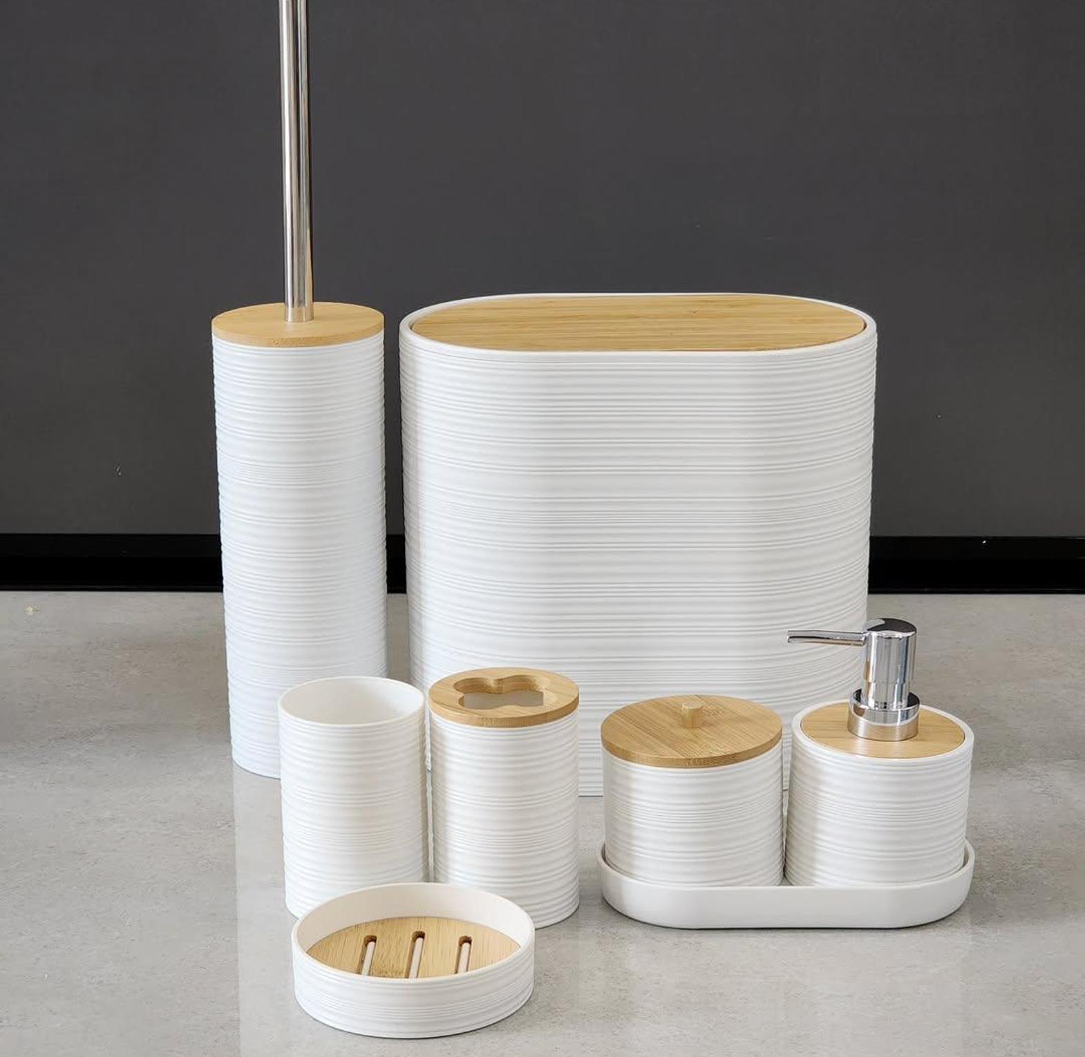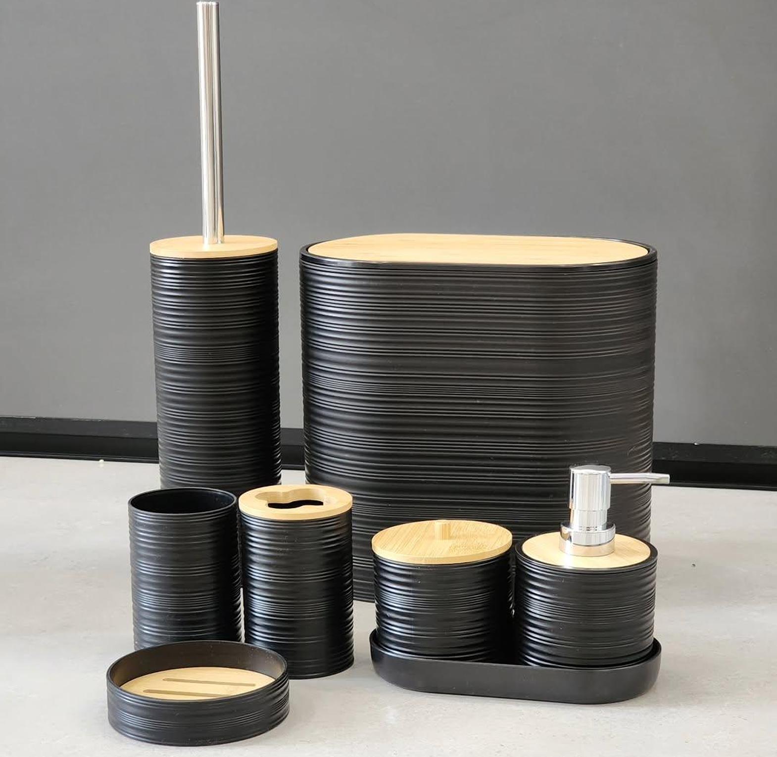 8pcs set Luxury Bathroom Accessories set with bamboo lids ▪️Consist of Trash can,Soap Dispenser, Soap Dish,Toilet Brush holder Toothbrush Holder cup