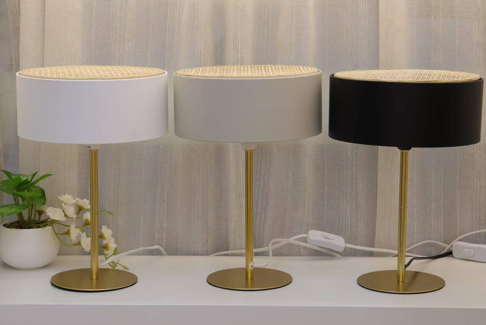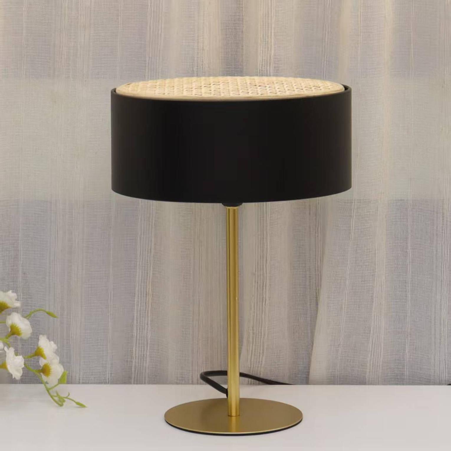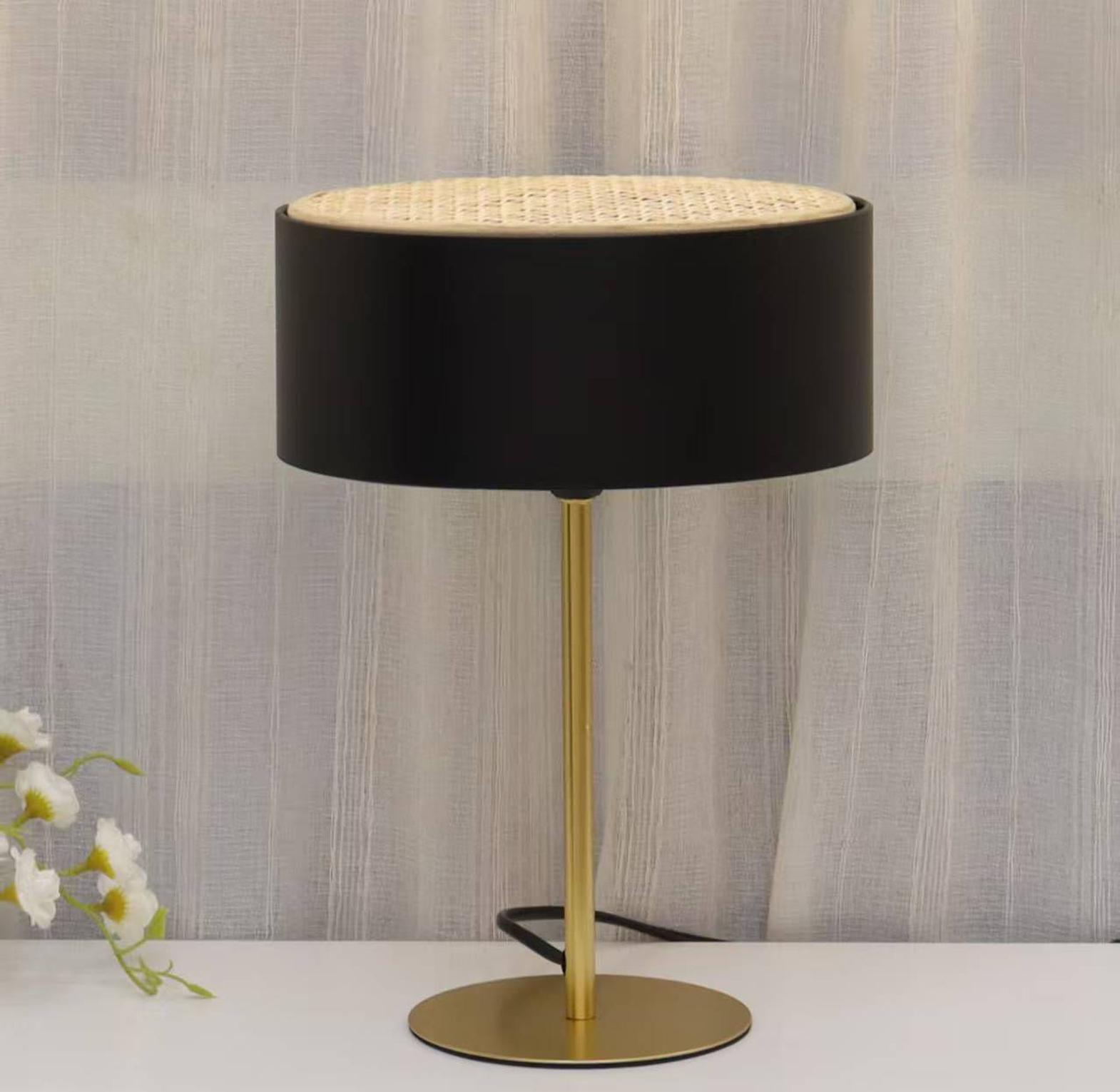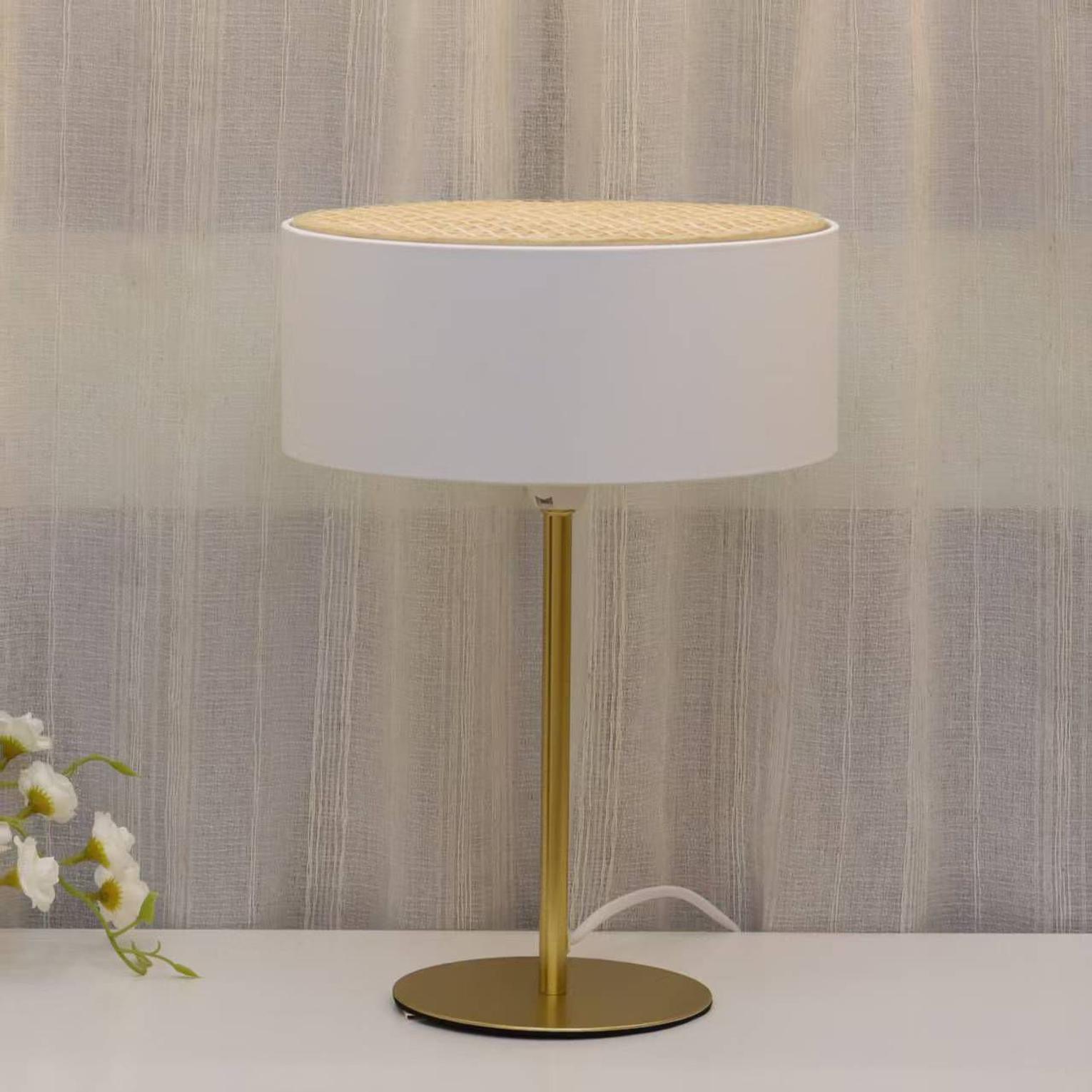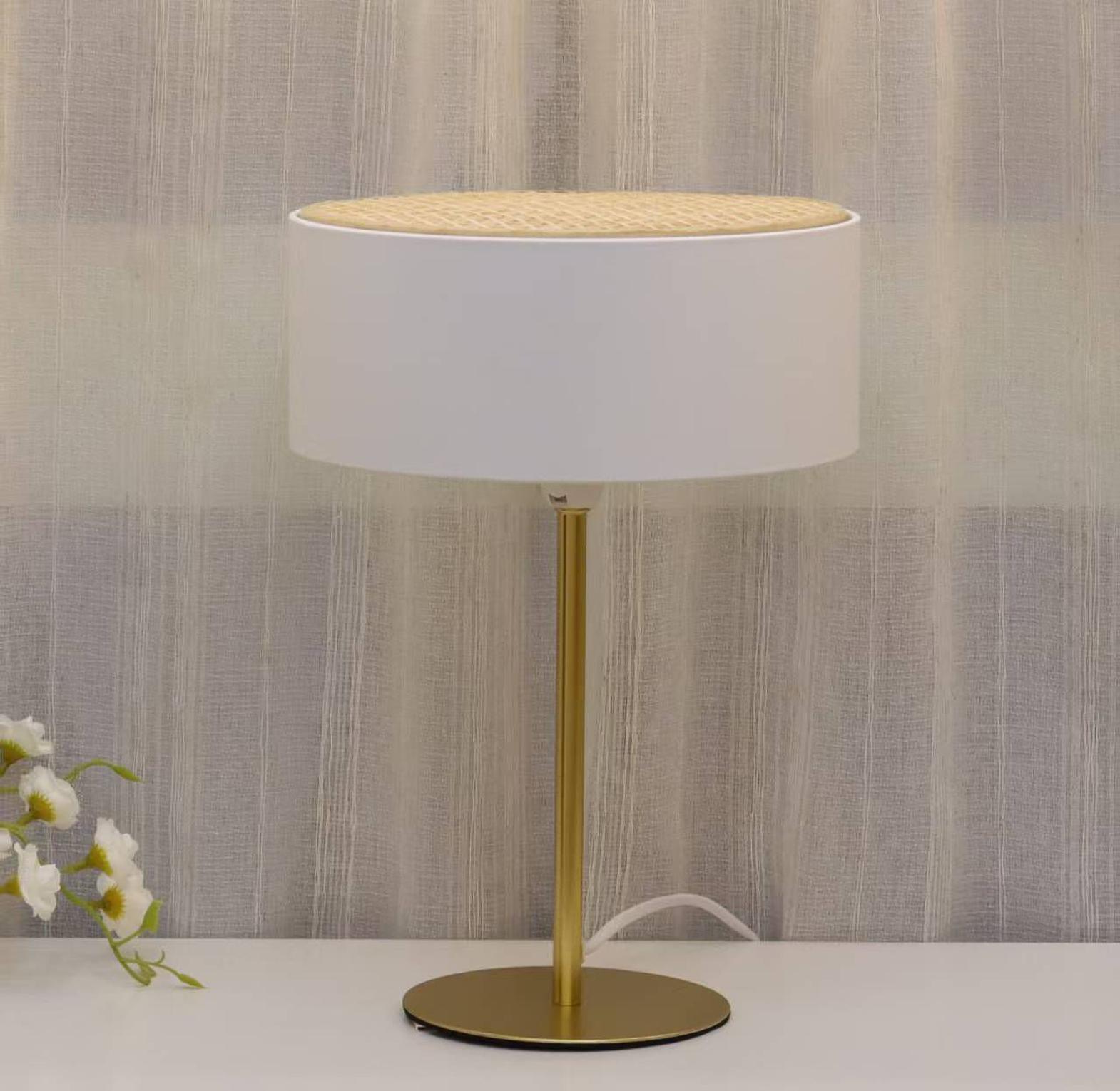 Modern bedside table lamp featuring a sleek fabric shade with a woven top detail and a sturdy gold metal base. Perfect for bedrooms, living rooms, or office spaces, it adds a warm, elegant touch to any décor.