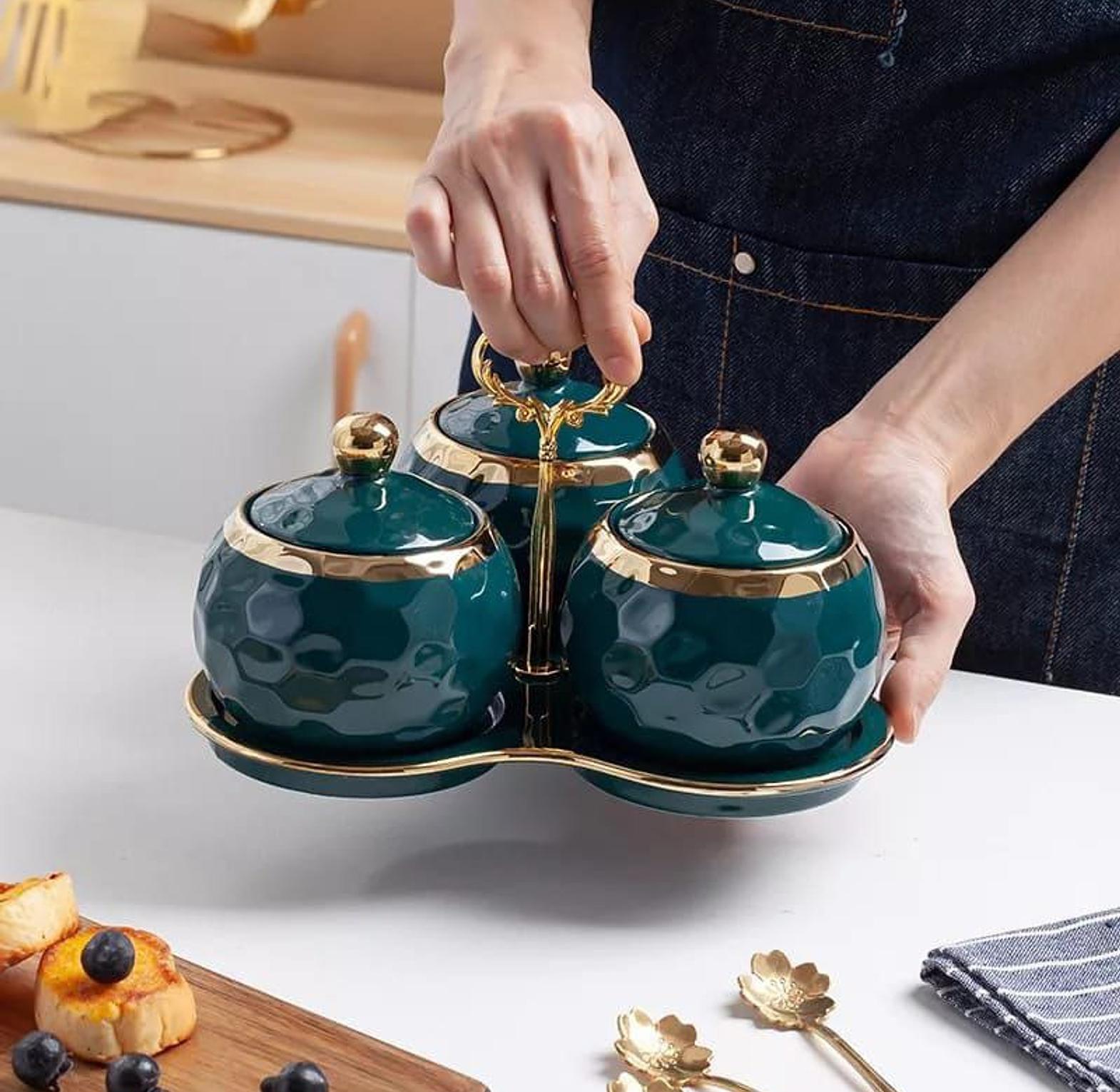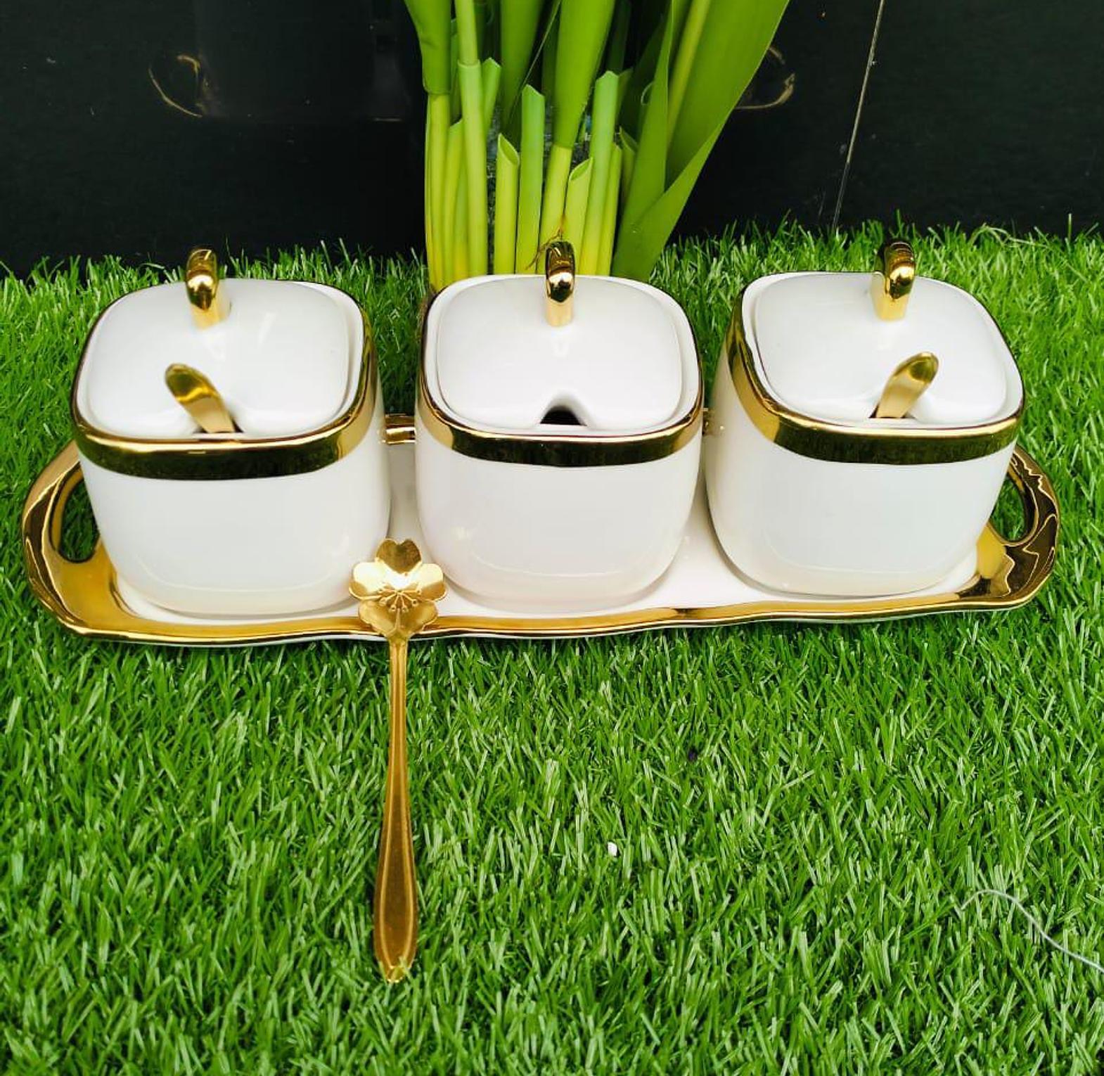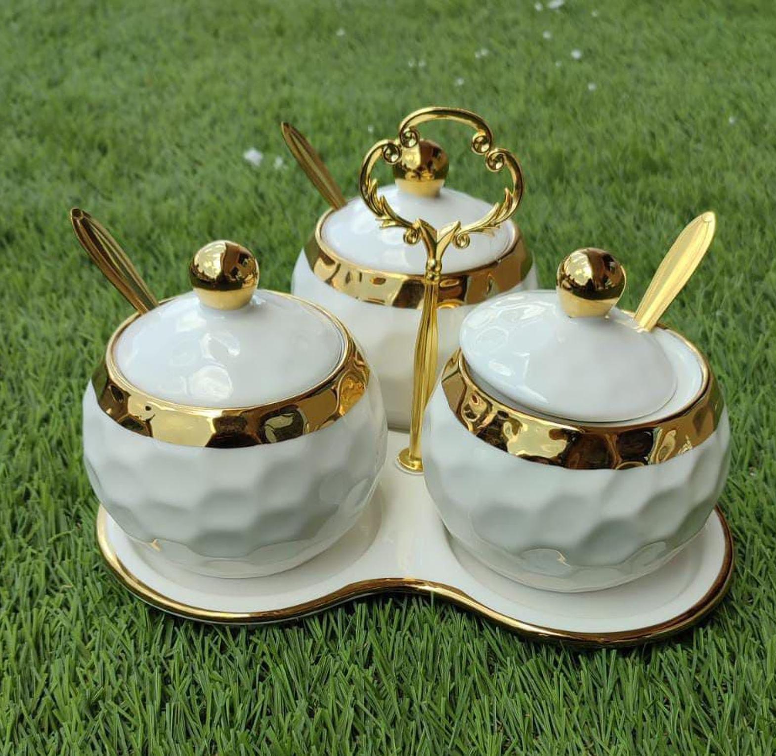 Ceramic Sugar dish set 3pcs of gold spoons 1 tray