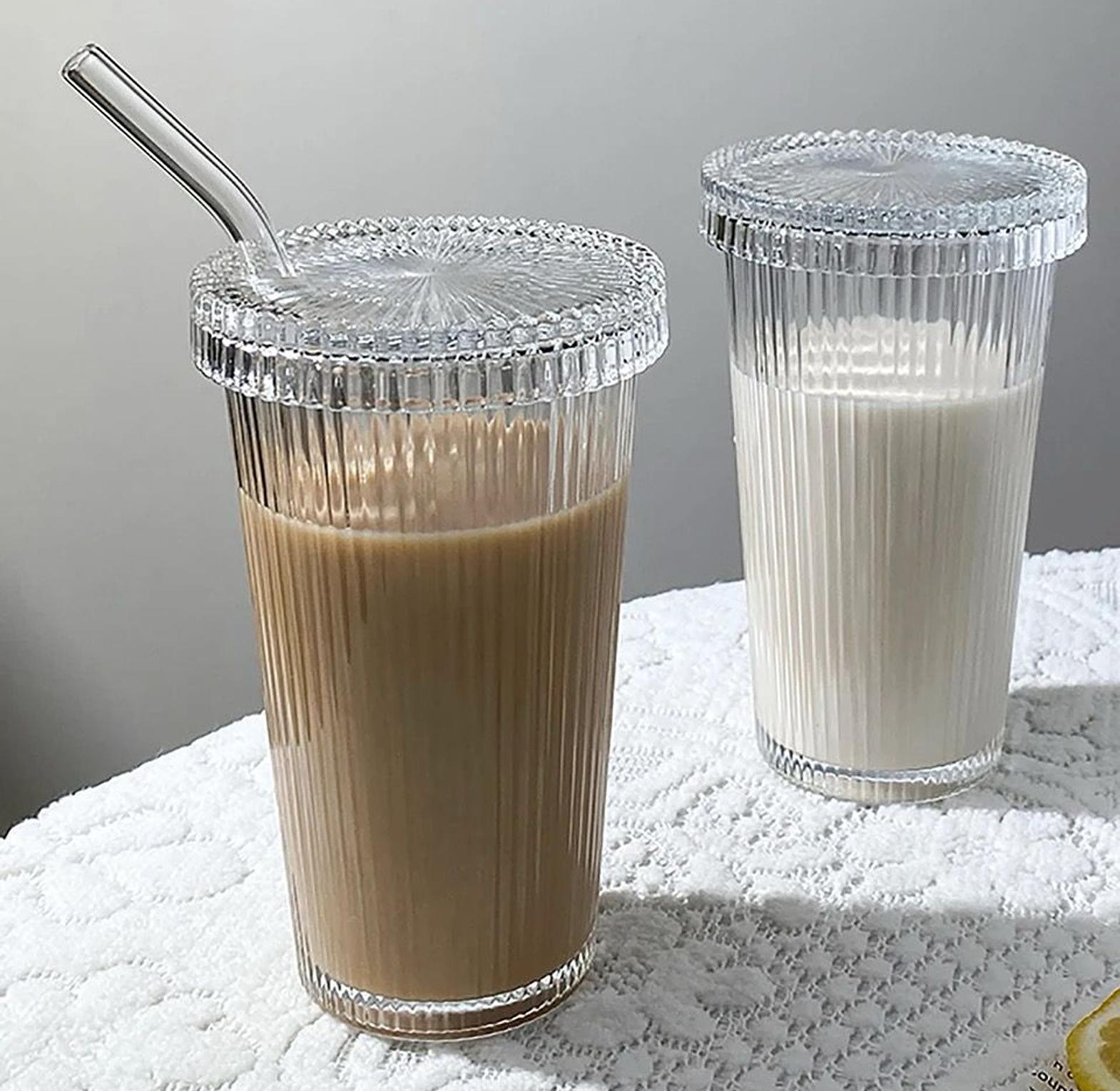 ✅375Ml Simple Stripe Glass Cup With Lid and Straw ✅Transparent Bubble Tea Cup Chic Juice Glass Milk Coffee Breakfast Cups