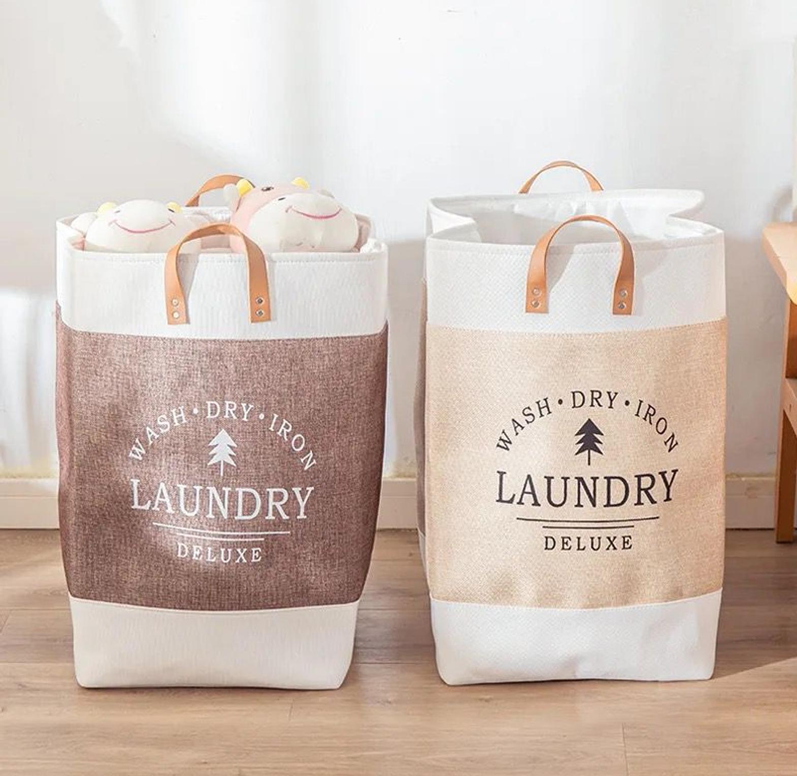 Linen Fabric Laundry Basket With Leather Handle Size 35*35*55cm Available in beige only