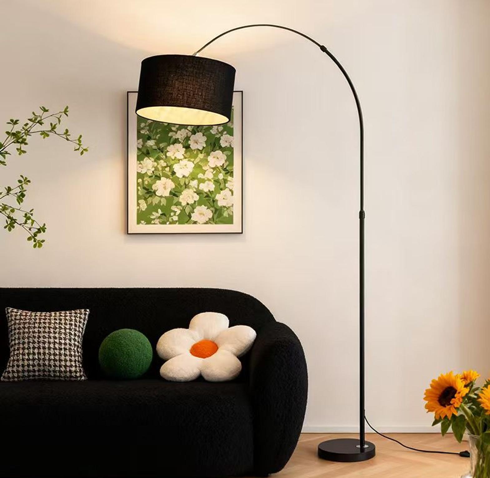 Modern arc floor lamp with a sleek black metal frame and wide fabric lampshade, perfect for adding warm ambient lighting to your living room or bedroom. Stylish, space-saving design that fits beautifully beside sofas and lounge chairs.