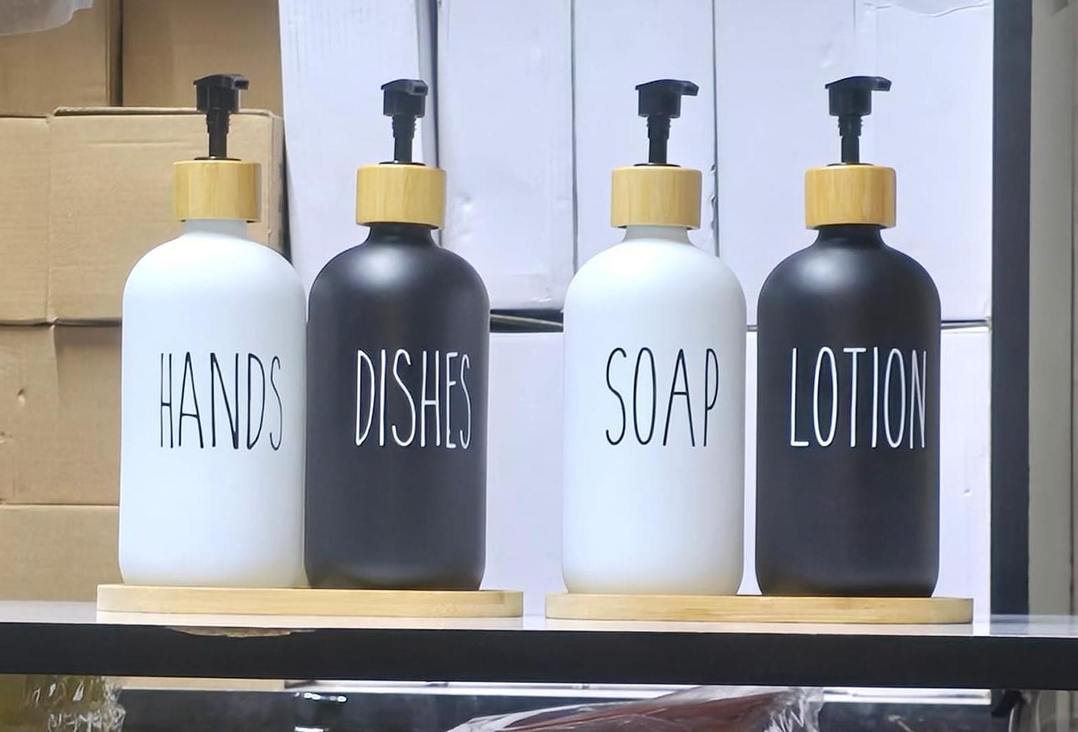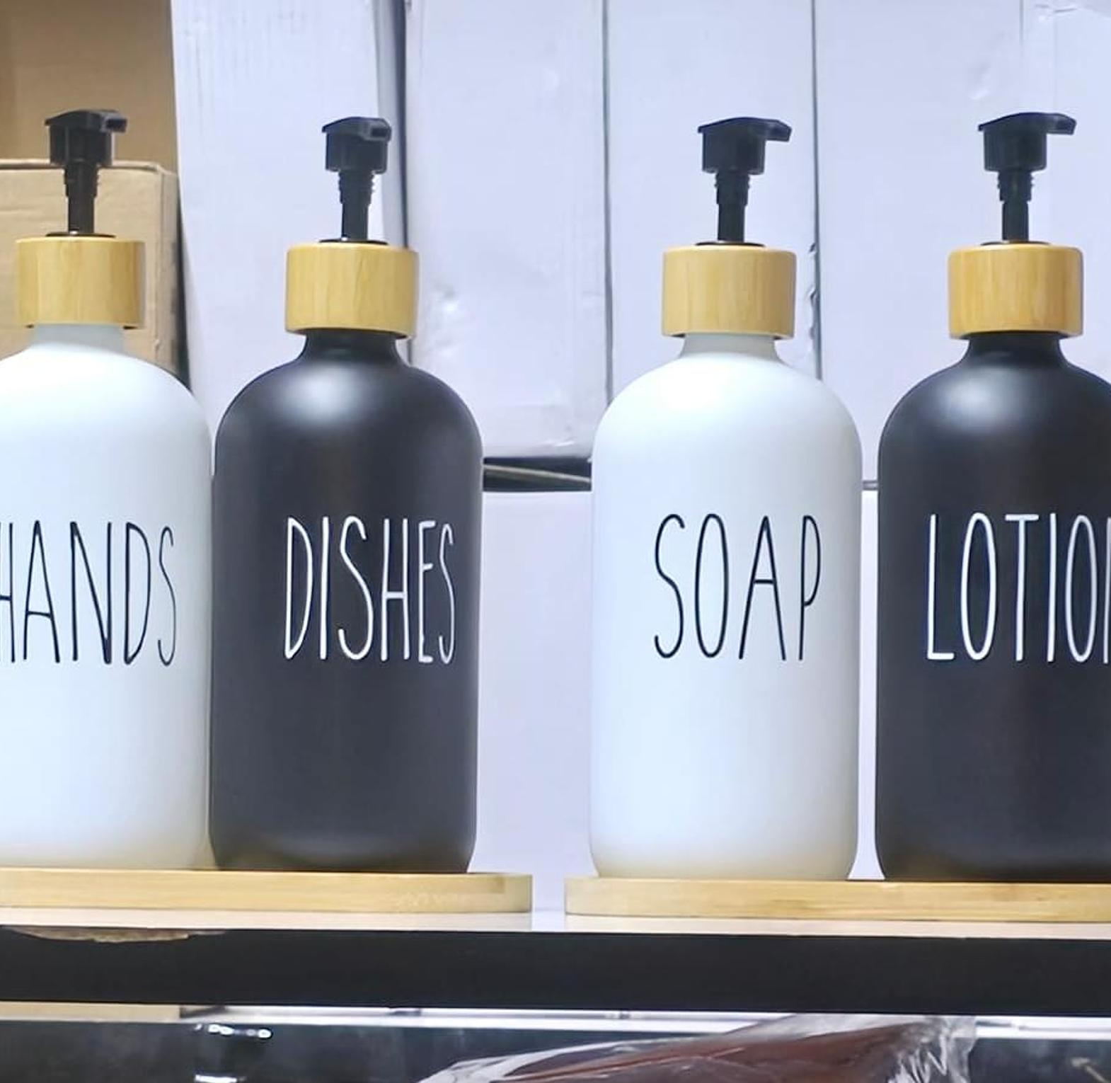 Ceramic soap Lotion Dispensers with bamboo holder. Hands& Dishes Soap lotion
