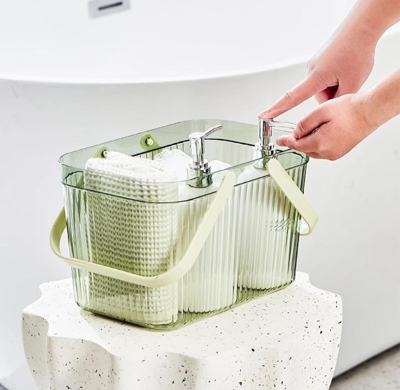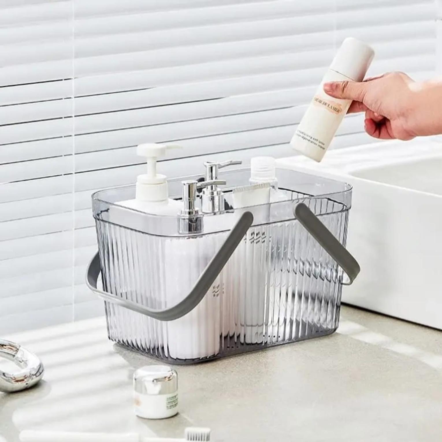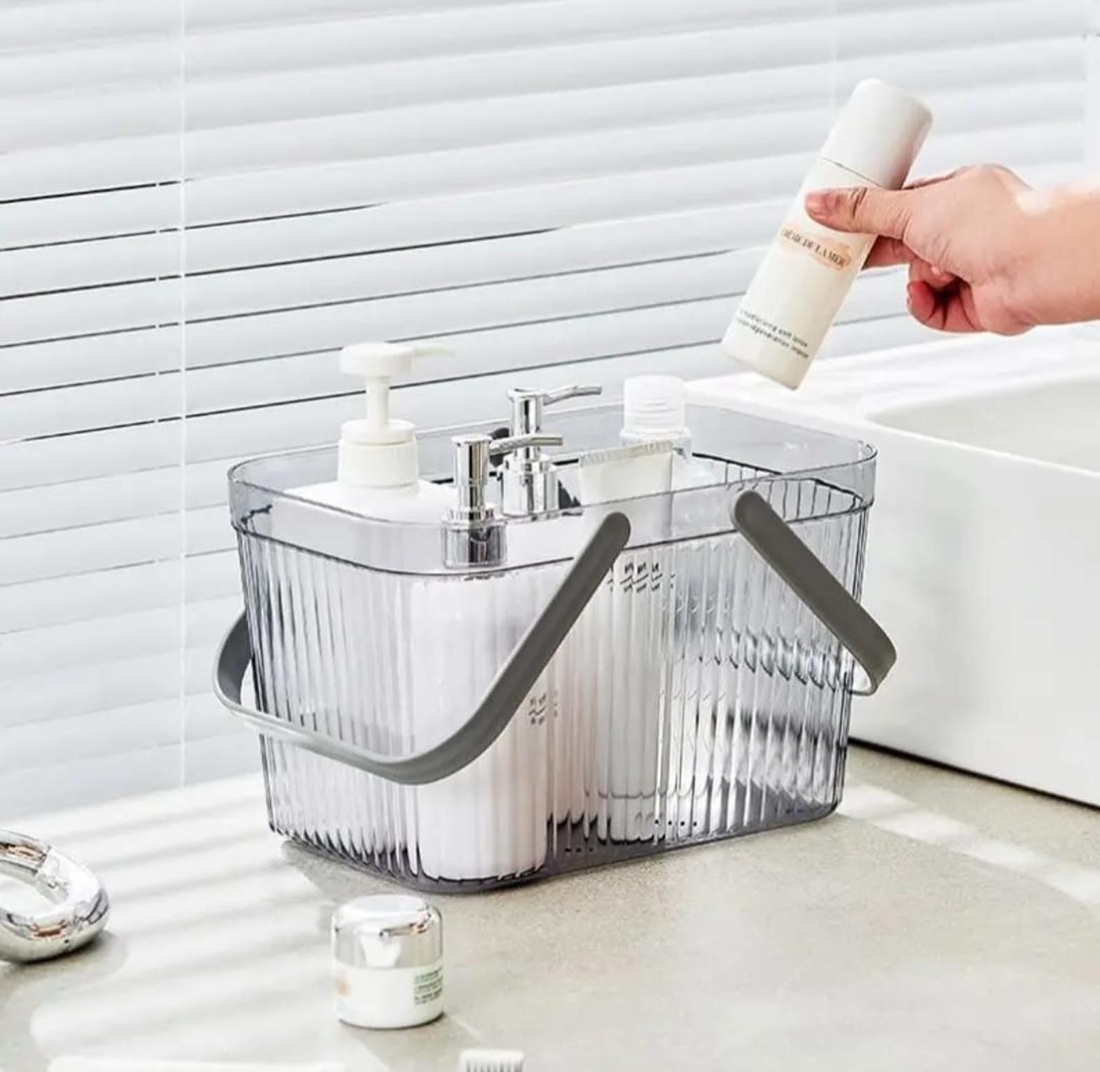 Transparent Bathroom basket •Durable PET with drainage design •Comes with a handle for easy carrying •Perfect for toiletries, bath tools & cosmetics •Multi-purpose hollow storage basket