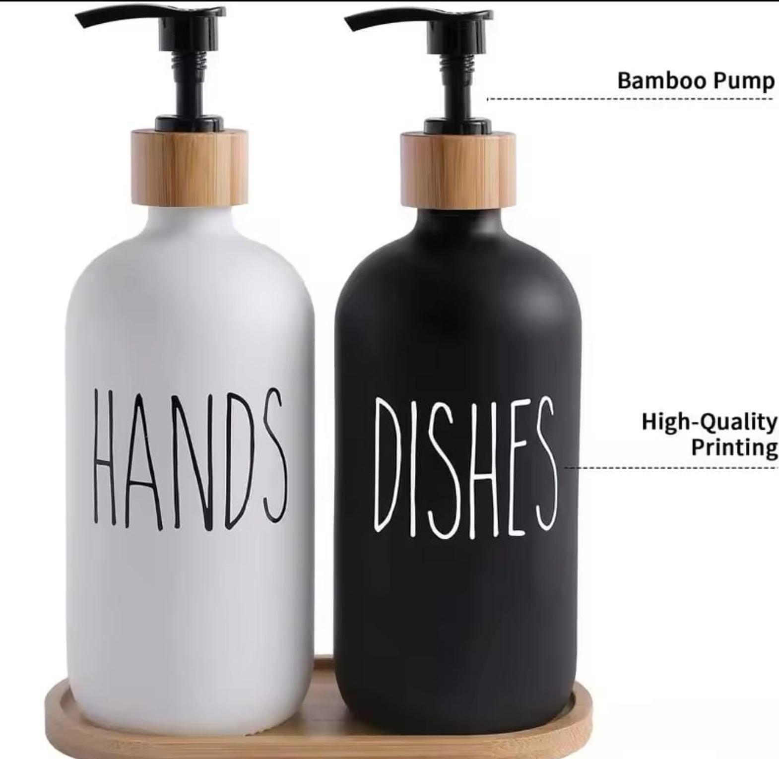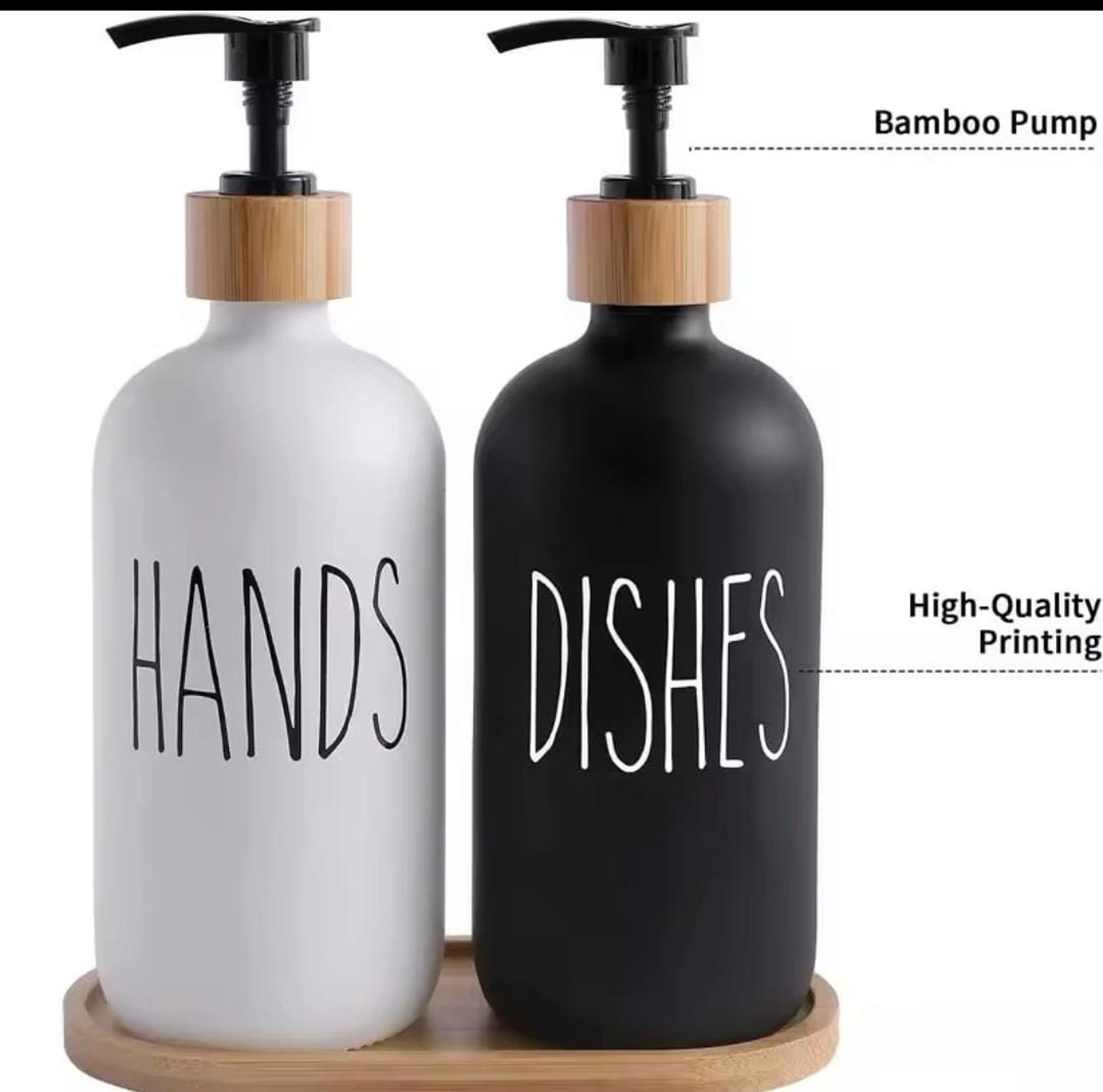 Ceramic soap Lotion Dispensers with bamboo holder. Hands& Dishes
