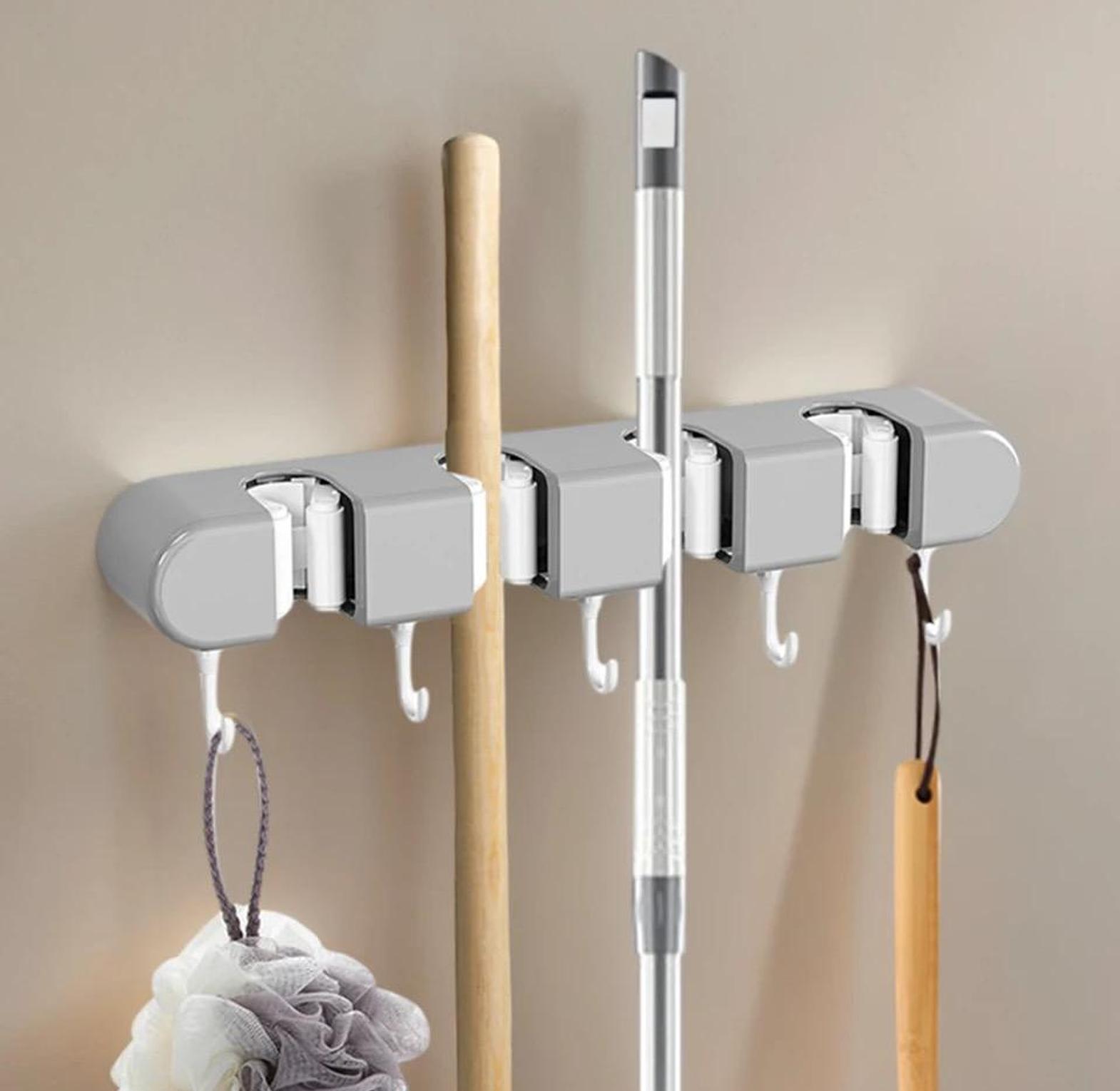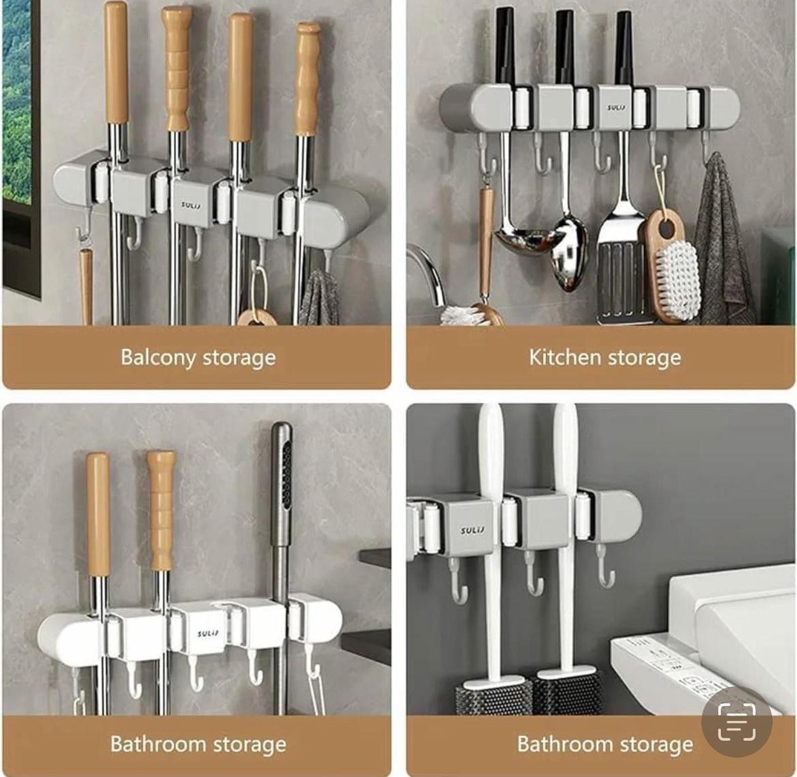*Restocked!!* *Non slip wall Mounted mop holder* ▫️4 Racks 5 Hooks ▫️Space-saving storage solution ▫️Drill-Free installation ▫️With gentle grip silicon ▫️High durability and stability ▫️Versatile holding capacity