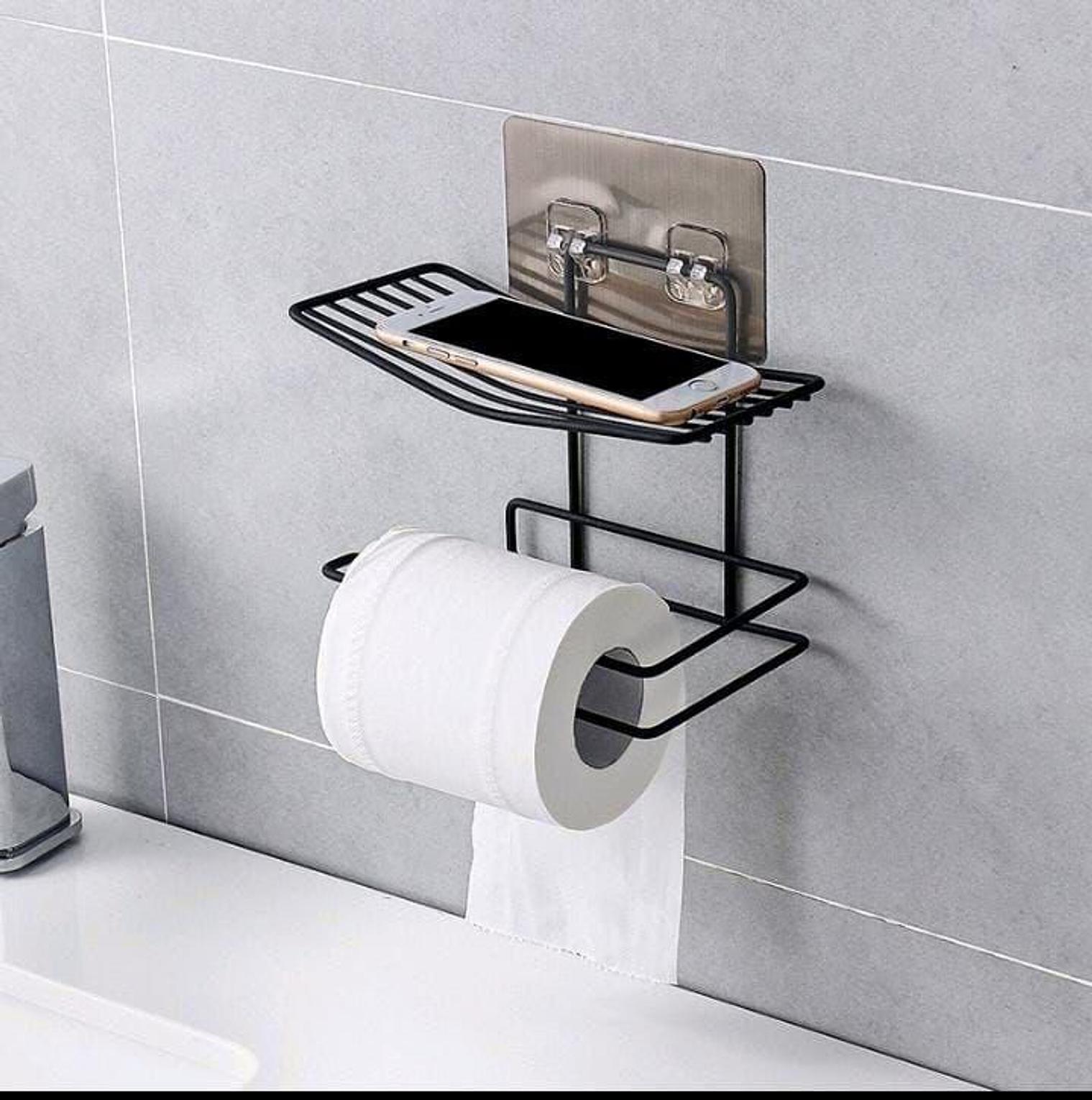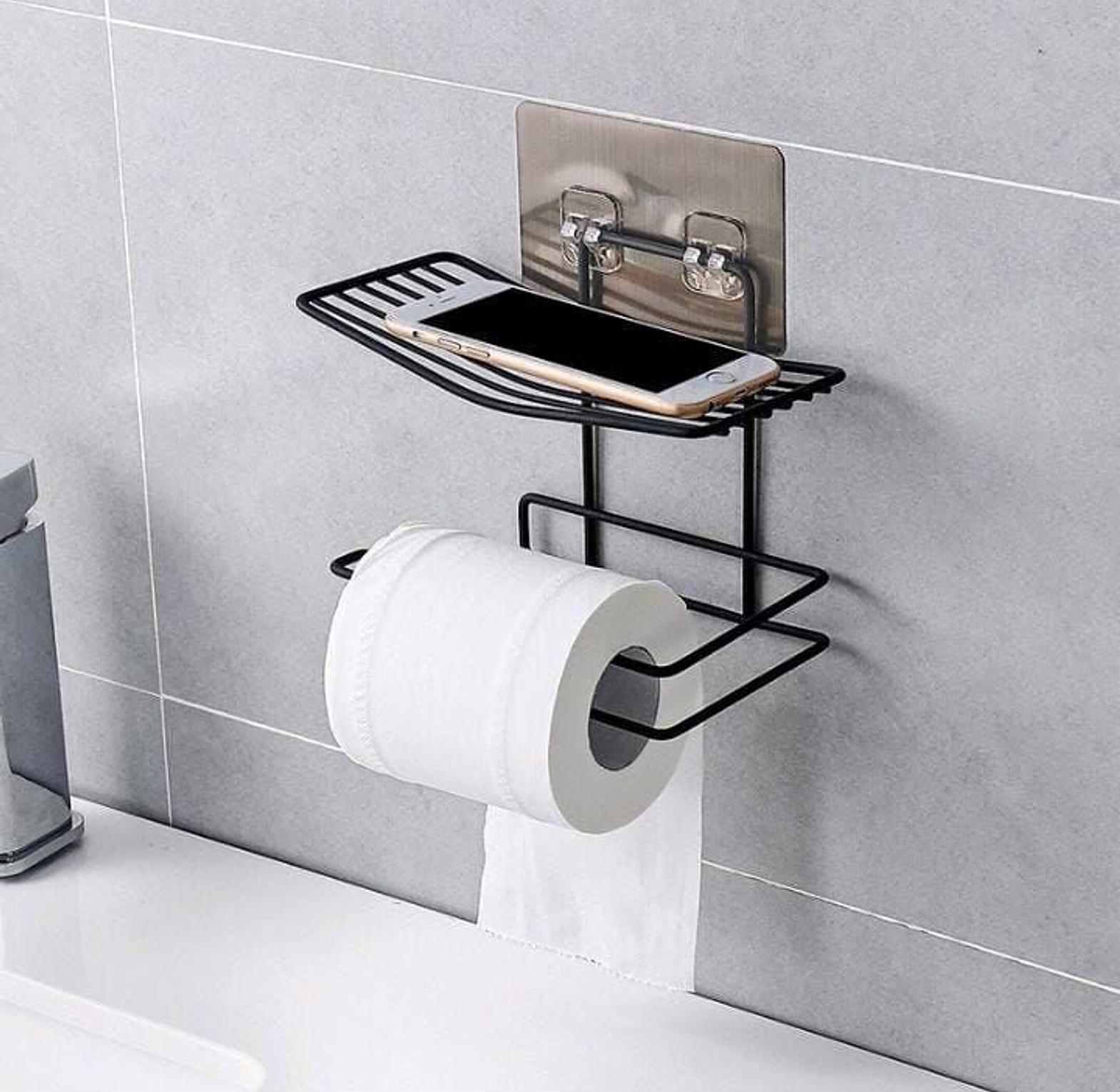 Wall-mounted toilet paper holder with a built-in top shelf, perfect for holding your phone or small essentials. Durable, space-saving design with easy adhesive installation for a neat and organized bathroom.
